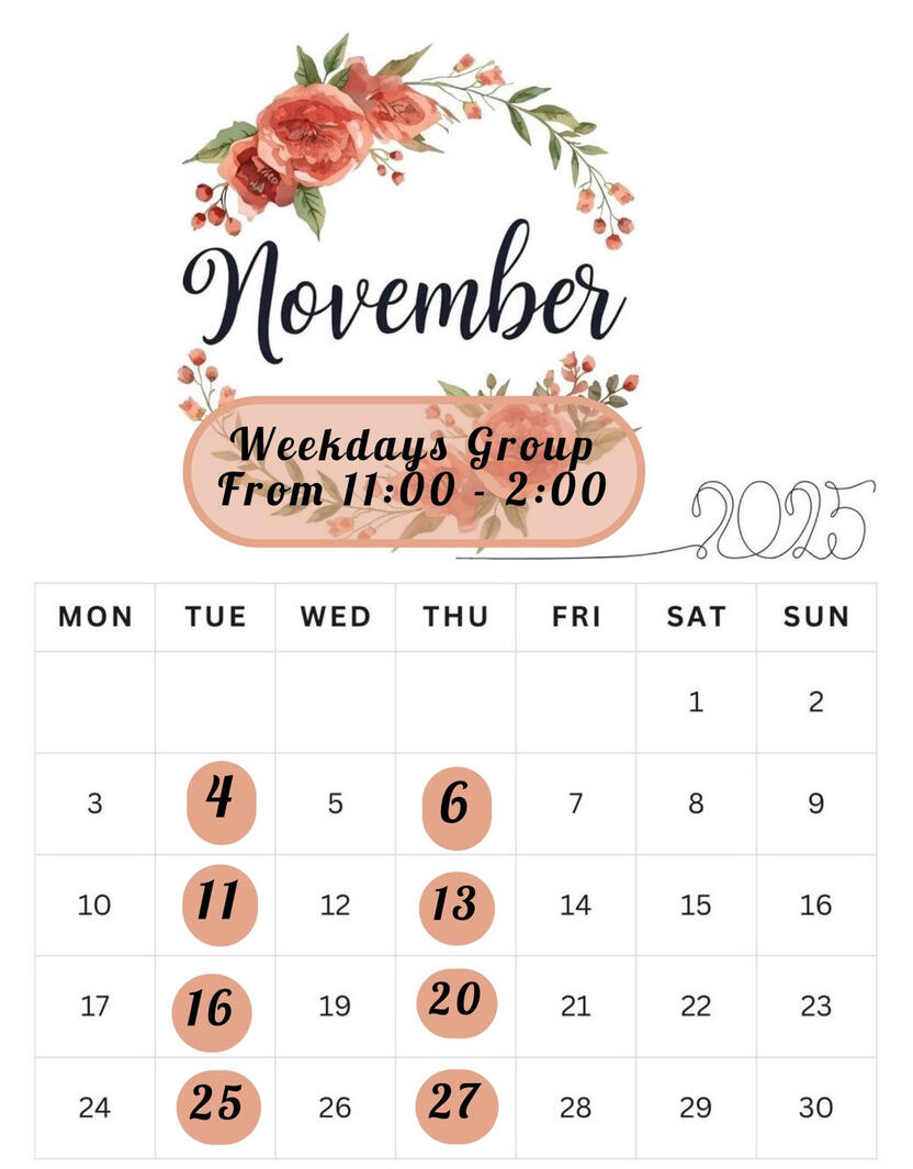 (11:00 am to 2:00 pm)Dates: 4th - 6th -11th -13th - 16th - 20th - 25th - 27th of November