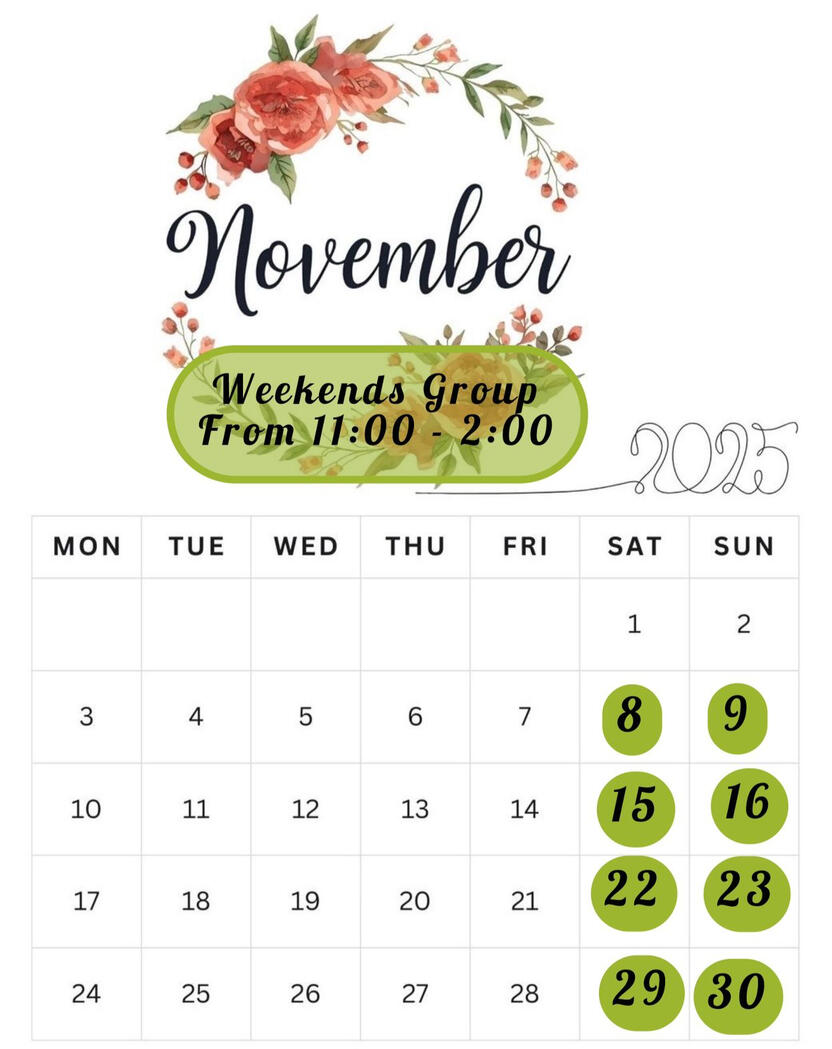 (11:00 am to 2:00 pm)Dates: 8th - 9th - 15th -16th - 22nd - 23rd - 29th - 30th of November